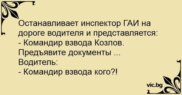 Останавливает инспектор ГАИ на дороге водителя и представляется: