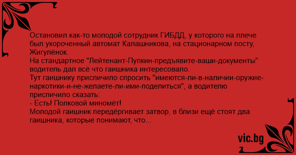 Остановил как-то молодой сотрудник ГИБДД, у которого на плече был укороченный автомат Калашникова, на стационарном посту, Жигулёнок.