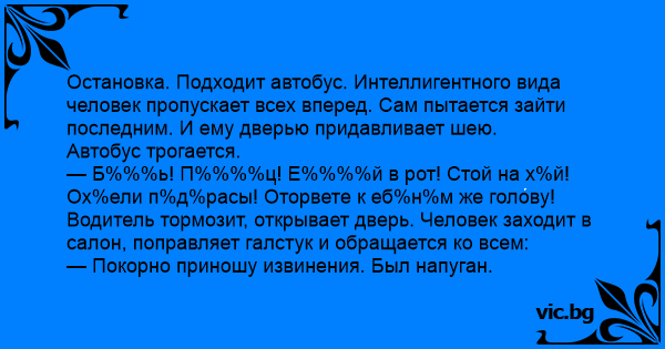 Остановка. Подходит автобус. Интеллигентного вида человек пропускает всех вперед. Сам пытается зайти последним. И ему дверью придавливает шею.