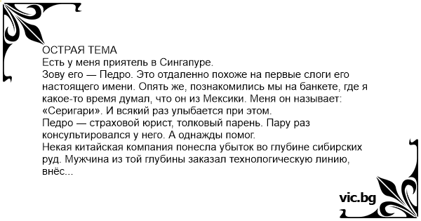 Педро ― страховой юрист, толковый парень. Пару раз консультировался у него. А однажды помог.