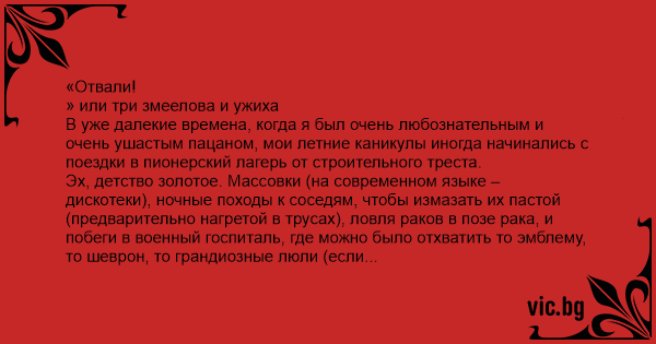 Вскоре мы с гордостью рассматривали банку, в которой нас материли целых три ужа. Поэтому к рододендронам добавились «ерпыль ушастый» (это персонально мне, кстати, было обидно), «устрица в шортах» (Игорю), «выпороток дятла» (Витале) и «растатуй вас свербигузом по самые пионерские галстуки» (безлично всей компании).