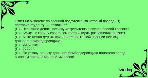 Ответ на экзамене по военной подготовке, за который препод (П) поставил студенту (С) "отлично":