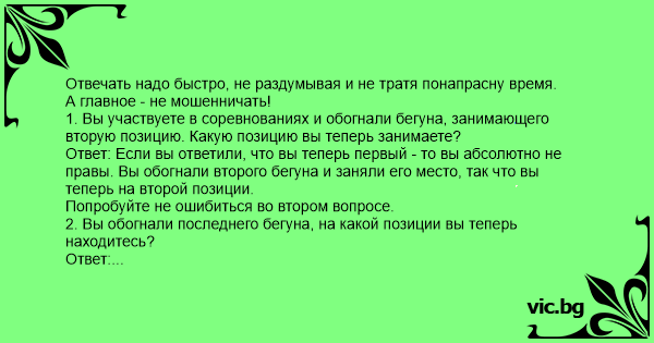 1. Вы участвуете в соревнованиях и обогнали бегуна, занимающего вторую позицию. Какую позицию вы теперь занимаете?
