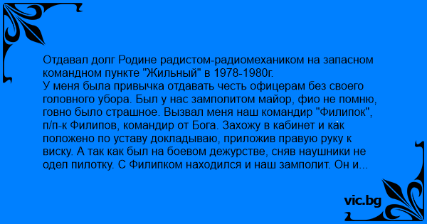 Отдавал долг Родине радистом-радиомехаником на запасном командном пункте "Жильный" в 1978-1980г. У меня была привычка отдавать честь офицерам без своего головного убора. Был у нас замполитом майор, фио не помню, говно было страшное. Вызвал меня наш командир "Филипок", п/п-к Филипов, командир от Бога. Захожу в кабинет и как положено по уставу докладываю, приложив правую руку к виску. А так как был на боевом дежурстве, сняв наушники не одел пилотку. С Филипком находился и наш замполит. Он и говорит: - К пустой голове руку не прикладывают. Мне бы промолчать, но чёрт дёрнул меня ответить: - Бывает и голова в фуражке с кокардой гудит как пустой жбан. Филипок улыбнулся, а замполита перекосило. Всё, думаю, губа обеспечена. Выслушав приказ и ответив: - Есть, разрешите выполнять, - я вышел из кабинета. Не знаю, откуда узнали об этом случае другие офицеры, но через часа три мне стали пророчить стать генералом. Кстати, все офицеры при встрече с нами, солдатами срочной службы после отдачи чести здоровались за руку, один замполит никогда руки не подавал.