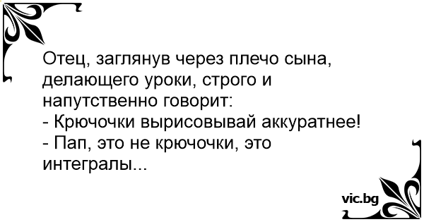 До сина, що робить уроки, ззаду підходить батько. Гладить сина по голові: — Старайся, синку, гачки пиши акуратніше. — Це не гачки, тато! Це інтеграли!!