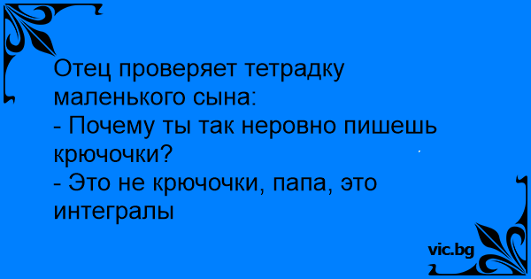 До сина, що робить уроки, ззаду підходить батько. Гладить сина по голові: — Старайся, синку, гачки пиши акуратніше. — Це не гачки, тато! Це інтеграли!!
