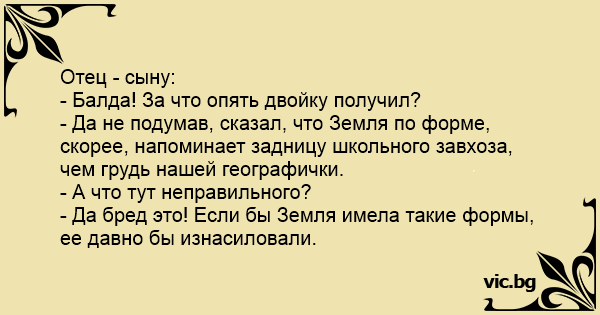 - Да не подумав, сказал, что Земля по форме, скорее, напоминает задницу школьного завхоза, чем грудь нашей географички.