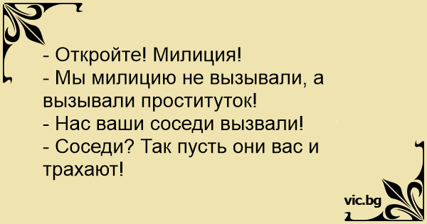 - Откройте, полиция! - Мы вас не вызывали, мы вызывали проституток! - Нас вызвали ваши соседи. - Ну так пусть они вас и еб@т!