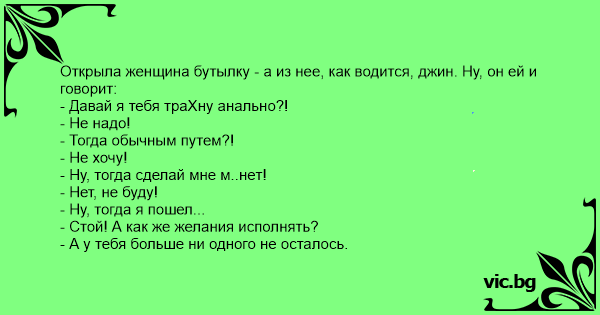 Открыла женщина бутылку - а из нее, как водится, джин. Ну, он ей и говорит: