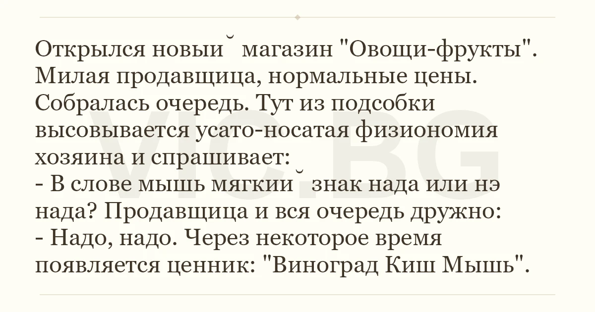 Открылся новый магазин "Овощи-фрукты". Милая продавщица, нормальные цены. Собралась очередь. Тут из подсобки высовывается усато-носатая физиономия хозяина и спрашивает: - В слове мышь мягкий знак нада или нэ нада? Продавщица и вся очередь дружно: - Надо, надо. Через некоторое время появляется ценник: "Виноград Киш Мышь".