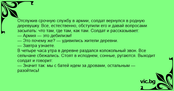 Отслужив срочную службу в армии, солдат вернулся в родную деревушку. Все, естественно, обступили его и давай вопросами засыпать: что там, где там, как там. Солдат и рассказывает: — Армия — это дебилизм! — Это почему же? — удивились жители деревни. — Завтра узнаете. В четыре часа утра в деревне раздался колокольный звон. Все сельчане сбежались. Стоят в исподнем, сонные, ругаются. Выходит солдат и говорит: — Значит так: мы с батей идем за дровами, остальным — разойтись!