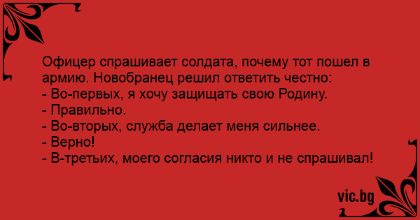 Офицер спрашивает солдата, почему тот пошел в армию. Новобранец решил ответить честно: