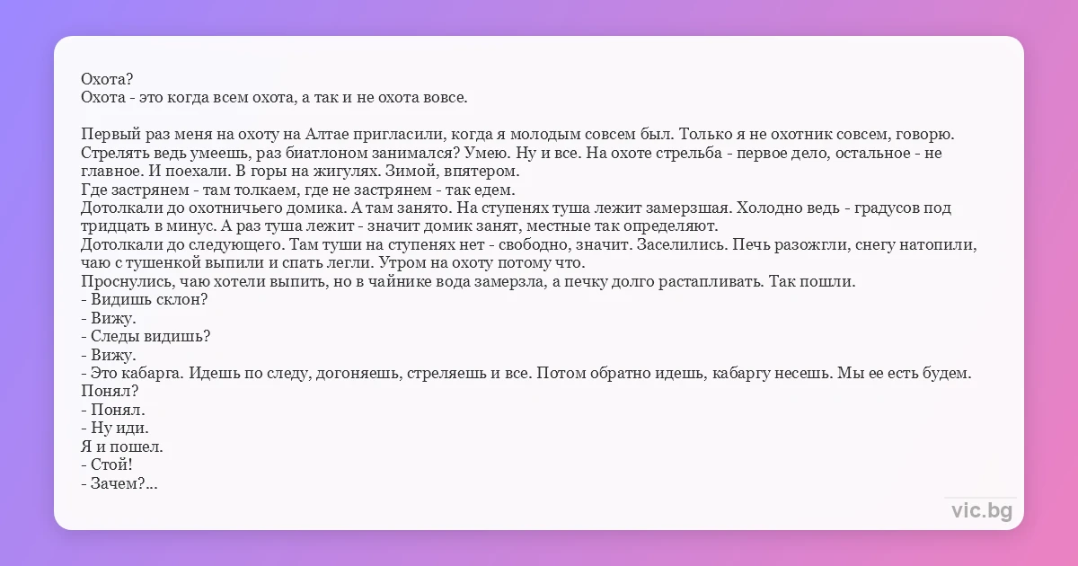 Первый раз меня на охоту на Алтае пригласили, когда я молодым совсем был. Только я не охотник совсем, говорю. Стрелять ведь умеешь, раз биатлоном занимался? Умею. Ну и все. На охоте стрельба - первое дело, остальное - не главное. И поехали. В горы на жигулях. Зимой, впятером. Где застрянем - там толкаем, где не застрянем - так едем. Дотолкали до охотничьего домика. А там занято. На ступенях туша лежит замерзшая. Холодно ведь - градусов под тридцать в минус. А раз туша лежит - значит домик занят, местные так определяют. Дотолкали до следующего. Там туши на ступенях нет - свободно, значит. Заселились. Печь разожгли, снегу натопили, чаю с тушенкой выпили и спать легли. Утром на охоту потому что. Проснулись, чаю хотели выпить, но в чайнике вода замерзла, а печку долго растапливать. Так пошли. - Видишь склон? - Вижу. - Следы видишь? - Вижу. - Это кабарга. Идешь по следу, догоняешь, стреляешь и все. Потом обратно идешь, кабаргу несешь. Мы ее есть будем. Понял? - Понял. - Ну иди. Я и пошел. - Стой! - Зачем? - Ружье возьми. Дали мне ружье. Трехствольное. И три патрона. Я даже спрашивать не стал почему патронов три. И так понятно. И пошел. По склону кабаргу догонять. Три раза навернулся со склона. Полчаса эти три ствола в снегу искал. Хорошо патроны в кармане непромокаемом были. И их искать не пришлось и порох надо сухим держать ведь. В четвертый раз как-то сразу в голову пришло, когда летел: ну его нафиг эту кабаргу. Кабаргой больше, кабаргой меньше. Тем более я ее ни разу не видел, встречу, могу и не узнать вовсе и какого-нибудь козла вместо нее грохнуть. А он мне ничего плохого не сделал. Она, впрочем, тоже. Ну их обоих, а я обратно пойду. И пошел. С ребятами встретился. Они тоже никого не встретили. Издалека, говорят, показывалась кабарга-то. А мы чаю попили и обратно жигули толкать стали. Чай на охоте - первое дело, остальное - не главное. Но тоже дело. На вторую охоту меня уже с директором пригласили. Я ж уже постарше, уровень повыше. И директор, опять же. Поэтому нам каждому по егерю специальному дали. Ружья тоже хотели дать, но я от своего отказался, мне в прошлый раз хватило. И вообще на охоте без ружья удобнее по снегу лазить. Тоже зима была, кстати. Не кстати то, что директор от ружья не отказался. Он вообще охотник был, по слухам. Так и пошли на охоту трое с ружьями, а я с рюкзаком только. Чай, конфеты и прочая еда. Я ж помню, что чай на охоте - первое дело, а остальное - не главное. Поэтому мы сначала костер развели, чаю выпили. Потом директор со своим егерем за зверем по следам ушли, а мы с моим остались чай пить. Пили, пили и чувствую надоедает чай-то. Даже егерю. По лицу видно. Тут егерь встал: - Пойдем, - говорит, - я тебе бобров покажу. У них тут плотина вниз по ручью недалеко совсем. Километра два. И мы пошли бобров смотреть. Впереди егерь с ружьем, сзади чай несу в термосе. Чай на охоте первое дело ведь, остальное - не главное. Идем, далеко уже ушли и слышим в кустах по ручью сопит кто-то совсем по-бобриному. Громко только. Я-то не знал тогда, как бобры сопят, а егерь сразу ружье вскинул. - Сейчас, - шепчет, - из него шапку сделаю. Или целый воротник. А из кустов директор выползает. Один. То есть с ружьем конечно, но без егеря. Он его потерял и под снег провалился, а там ручей тот самый с бобрами. Так мокрый и полз всю дорогу в валенках и без егеря. Метров пятьдесят до нас полз. Сразу видно, что устал человек. Так я е