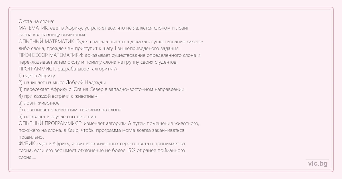 Охота на слона: МАТЕМАТИК: едет в Африку, устраняет все, что не является слоном и ловит слона как разницу вычитания. ОПЫТНЫЙ МАТЕМАТИК: будет сначала пытаться доказать существование какого- либо слона, прежде чем приступит к шагу 1 вышеприведеного задания. ПРОФЕССОР МАТЕМАТИКИ: доказывает существование определенного слона и перекладывает затем охоту и поимку слона на группу своих студентов. ПРОГРАММИСТ: разрабатывает алгоритм А: 1) едет в Африку 2) начинает на мысе Доброй Надежды 3) пересекает Африку с Юга на Север в западно-восточном направлении. 4) при каждой встречи с животным: а) ловит животное б) сравнивает с животным, похожим на слона в) оставляет в случае соответствия ОПЫТНЫЙ ПРОГРАММИСТ: изменяет алгоритм А путем помещения животного, похожего на слона, в Каир, чтобы программа могла всегда заканчиваться правильно. ФИЗИК: едет в Африку, ловит всех животных серого цвета и принимает за слона, если его вес имеет отклонение не более 15% от ранее пойманного слона. ЭКОНОМИСТ: не ловит слонов. Считает, что если достаточно платить слоны придут сами. СТАТИСТИК: ловит первое животное, которое видит n раз и называет его слоном. МЕНЕДЖЕР: не ловит слонов. Он вообще никогда никого не ловит. Но время от времени его призывают, чтобы он мог дать свои полезные советы. СИСТЕМНЫЙ АНАЛИТИК: теоретически может определить отношение между размером пули и квотой поподания на слоновой охоте, если ему кто-то скажет, что такое слон. СОЗДАТЕЛЬ КОМПЬЮТЕРНЫХ ВИРУСОВ: посылает мышку на мыс Доброй Надежды и ожидает в Каире стада перепуганных слонов.