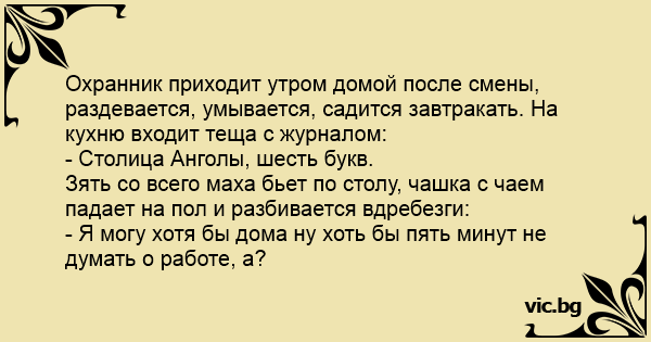 Охранник приходит утром домой после смены, раздевается, умывается, садится завтракать. На кухню входит теща с журналом: