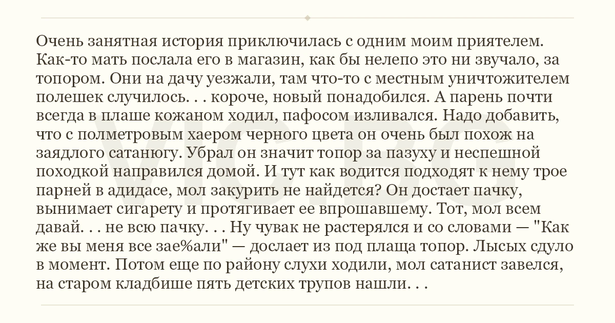 Как-то мать послала его в магазин, как бы нелепо это ни звучало, за топором. Они на дачу уезжали, там что-то с местным уничтожителем полешек случилось. . . короче, новый понадобился. А парень почти всегда в плаше кожаном ходил, пафосом изливался. Надо добавить, что с полметровым хаером черного цвета он очень был похож на заядлого сатанюгу. Убрал он значит топор за пазуху и неспешной походкой направился домой. И тут как водится подходят к нему трое парней в адидасе, мол закурить не найдется? Он достает пачку, вынимает сигарету и протягивает ее впрошавшему. Тот, мол всем давай. . . не всю пачку. . . Ну чувак не растерялся и со словами — "Как же вы меня все зае%али" — дослает из под плаща топор. Лысых сдуло в момент. Потом еще по району слухи ходили, мол сатанист завелся, на старом кладбише пять детских трупов нашли. . .