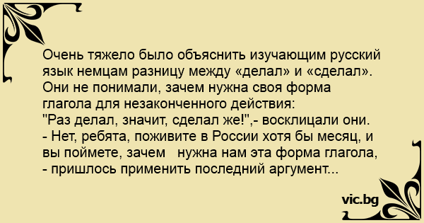 Очень тяжело было объяснить изучающим русский язык немцам разницу между «делал» и «сделал». Они не понимали, зачем нужна своя форма глагола для незаконченного действия: