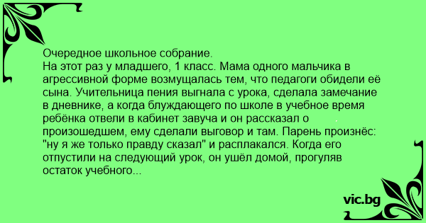 На этот раз у младшего, 1 класс. Мама одного мальчика в агрессивной форме возмущалась тем, что педагоги обидели её сына. Учительница пения выгнала с урока, сделала замечание в дневнике, а когда блуждающего по школе в учебное время ребёнка отвели в кабинет завуча и он рассказал о произошедшем, ему сделали выговор и там. Парень произнёс: "ну я же только правду сказал" и расплакался. Когда его отпустили на следующий урок, он ушёл домой, прогуляв остаток учебного дня. А предыстория такова. На уроке пения дети разучивали безобидную детскую песенку о свадьбе ёжика и зайчихи. В какой-то момент мальчик поднял руку, встал и сказал: "а как же они спариваться будут? Межвидовое скрещивание невозможно. У зайца и ежа разный набор хромосом..." Покрасневшая учительница сделала в дневнике запись о плохом поведении, обозвала пошляком и извращенцем, выгнала из класса. А ведь он просто правду сказал. Родителей его я знаю, живут в нашем подъезде. Отец - хирург, мать тоже как-то связана с медициной.