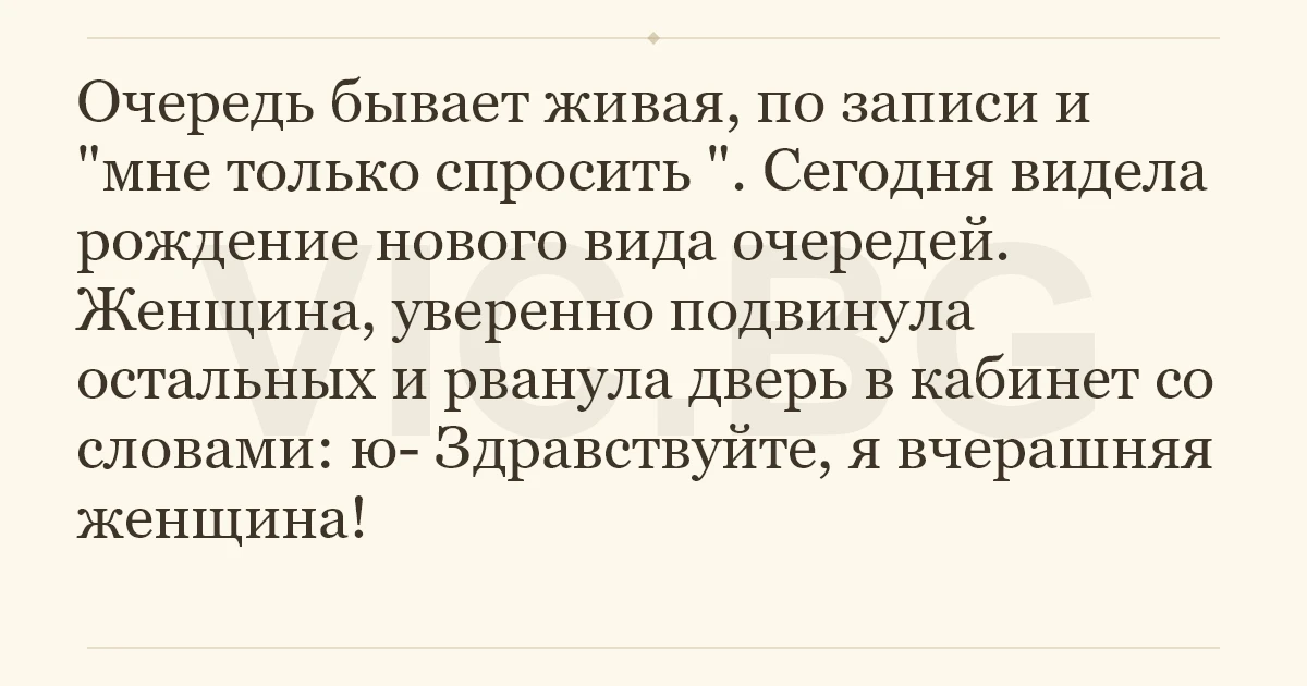 Очередь бывает живая, по записи и "мне только спросить ". Сегодня видела рождение нового вида очередей. Женщина, уверенно подвинула остальных и рванула дверь в кабинет со словами: ю- Здравствуйте, я вчерашняя женщина!