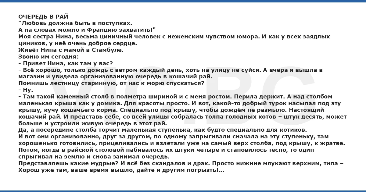 ОЧЕРЕДЬ В РАЙ "Любовь должна быть в поступках. А на словах можно и Францию захватить!" Моя сестра Нина, весьма циничный человек с неженским чувством юмора. И как у всех заядлых циников, у неё очень доброе сердце. Живёт Нина с мамой в Стамбуле. Звоню им сегодня: - Привет Нина, как там у вас? - Всё хорошо, только дождь с ветром каждый день, хоть на улицу не суйся. А вчера я вышла в магазин и увидела организованную очередь в кошачий рай. Помнишь лестницу старинную, от нас к морю спускаться? - Ну. - Там такой каменный столб в полметра шириной и с меня ростом. Перила держит. А над столбом маленькая крыша как у домика. Для красоты просто. И вот, какой-то добрый турок насыпал под эту крышу, кучу кошачьего корма. Специально под крышу, чтобы дождём не размыло. Настоящий кошачий рай. И представь себе, со всей улицы собралась толпа голодных котов – штук десять, может больше и устроили живую очередь в этот рай. Да, а посередине столба торчит маленькая ступенька, как будто специально для котиков. И вот они организованно, друг за другом, по одному запрыгивали сначала на эту ступеньку, там хорошенько готовились, прицеливались и взлетали уже на самый верх столба, под крышу, к жратве. Потом, когда в райской столовой набивалось их штуки четыре и становилось тесно, то один спрыгивал на землю и снова занимал очередь. Представляешь какие мудрые? И всё без скандалов и драк. Просто нижние мяукают верхним, типа – Хорош уже там, ваше время вышло, дайте и другим погрызть! Я даже остановилась понаблюдать. Смотрю, а в очереди стоит какой-то тупой кот с дурными глазами. - Почему тупой? - Потому что не умеет дорогу переходить, придурок. Задняя нога вывернута и еле шевелится, явно под машину попадал, идиота кусок. Хоть старый на вид, а дуpak-дураком. Подошла его очередь, на полочку он ещё кое-как запрыгнул, прицелился, а нога-то толчковая одна, естественно, он и близко не допрыгнул до столовой и упал, как жаба. Встал, отряхнулся и опять очередь занял. Вторая попытка ещё хуже, спикировал башкой на камни и снова в очередь, попытка не пытка, времени много у придурка, дел больше никаких. После третьей попытки мог бы уже понять что не допрыгнет. Зачем зря мучиться? Он ведь ещё трагически взвизгивал при прыжке, толкаться-то больно поломанной ногой. В общем, туповат. - Бедный котик. - Ничего в нём бедного нет, он сам кузнец своего счастья, нужно было вовремя правила дорожного движения учить. - Вот ты жестокая. - Я, да, жестокая, а зато угадай - кто сейчас напротив меня на кресле сидит, пригрелся и смотрит добрыми глазами? - Хромой котик!? - Нет, наша мама. - Да ну тебя. - А угадай, кто сидит у неё на коленях, вытаращил дурные глаза на кошачий корм, мяукает и нагло требует глажки…?