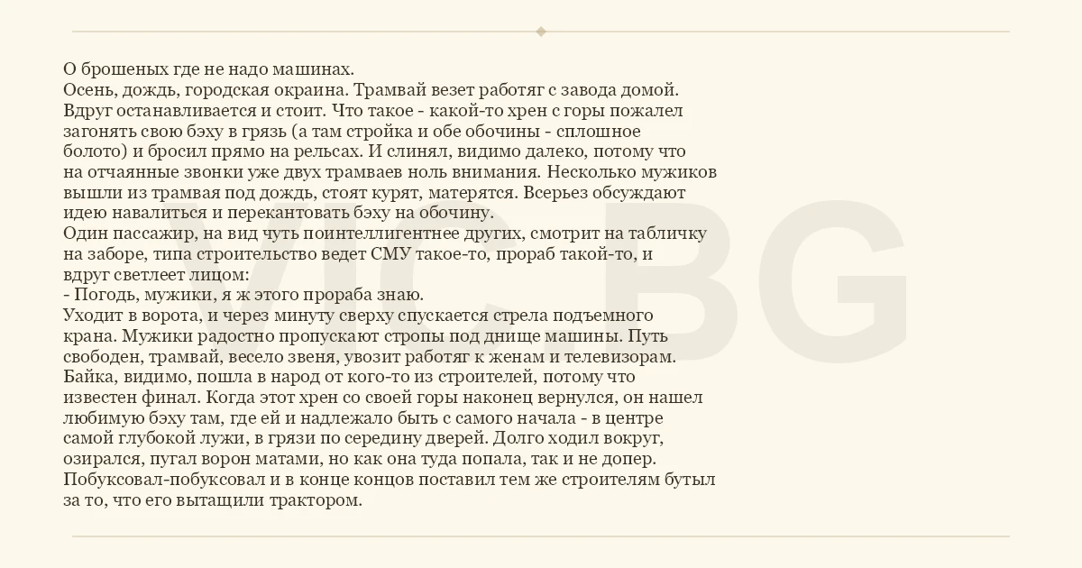 О брошеных где не надо машинах. Осень, дождь, городская окраина. Трамвай везет работяг с завода домой. Вдруг останавливается и стоит. Что такое - какой-то хpeн с горы пожалел загонять свою бэху в грязь (а там стройка и обе обочины - сплошное болото) и бросил прямо на рельсах. И слинял, видимо далеко, потому что на отчаянные звонки уже двух трамваев ноль внимания. Несколько мужиков вышли из трамвая под дождь, стоят курят, матерятся. Всерьез обсуждают идею навалиться и перекантовать бэху на обочину. Один пассажир, на вид чуть поинтеллигентнее других, смотрит на табличку на заборе, типа строительство ведет СМУ такое-то, прораб такой-то, и вдруг светлеет лицом: - Погодь, мужики, я ж этого прораба знаю. Уходит в ворота, и через минуту сверху спускается стрела подъемного крана. Мужики радостно пропускают стропы под днище машины. Путь свободен, трамвай, весело звеня, увозит работяг к женам и телевизорам. Байка, видимо, пошла в народ от кого-то из строителей, потому что известен финал. Когда этот хpeн со своей горы наконец вернулся, он нашел любимую бэху там, где ей и надлежало быть с самого начала - в центре самой глубокой лужи, в грязи по середину дверей. Долго ходил вокруг, озирался, пугал ворон матами, но как она туда попала, так и не допер. Побуксовал-побуксовал и в конце концов поставил тем же строителям бутыл за то, что его вытащили трактором.