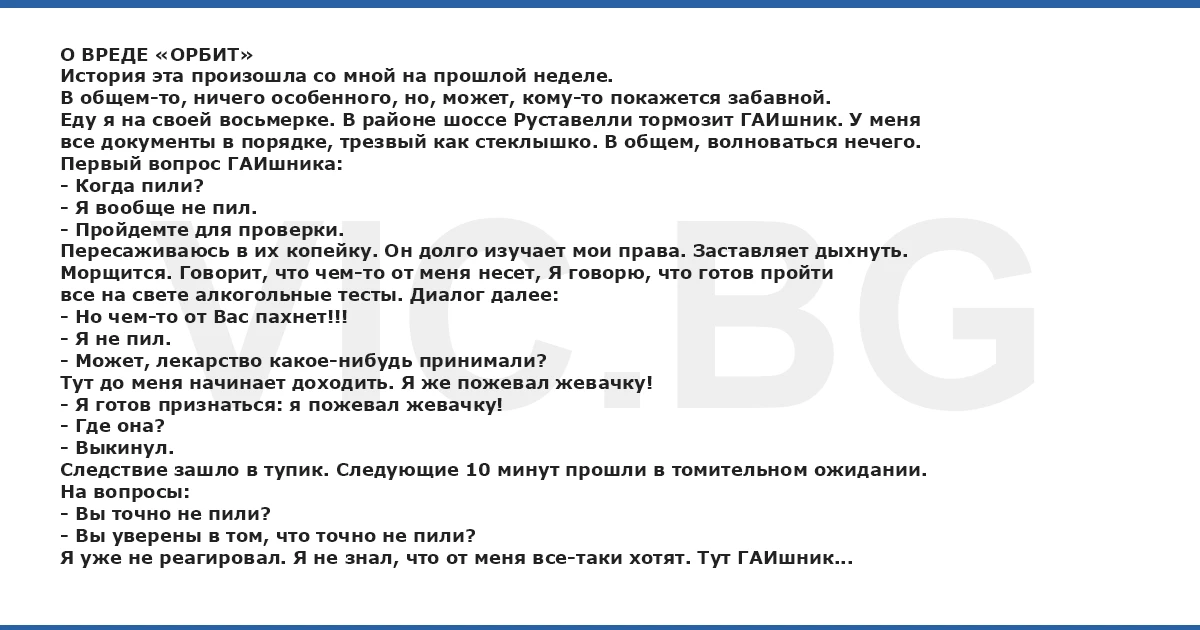 О ВРЕДЕ «ОРБИТ» История эта произошла со мной на прошлой неделе. В общем-то, ничего особенного, но, может, кому-то покажется забавной. Еду я на своей восьмерке. В районе шоссе Руставелли тормозит ГАИшник. У меня все документы в порядке, трезвый как стеклышко. В общем, волноваться нечего. Первый вопрос ГАИшника: - Когда пили? - Я вообще не пил. - Пройдемте для проверки. Пересаживаюсь в их копейку. Он долго изучает мои права. Заставляет дыхнуть. Морщится. Говорит, что чем-то от меня несет, Я говорю, что готов пройти все на свете алкогольные тесты. Диалог далее: - Но чем-то от Вас пахнет!!! - Я не пил. - Может, лекарство какое-нибудь принимали? Тут до меня начинает доходить. Я же пожевал жевачку! - Я готов признаться: я пожевал жевачку! - Где она? - Выкинул. Следствие зашло в тупик. Следующие 10 минут прошли в томительном ожидании. На вопросы: - Вы точно не пили? - Вы уверены в том, что точно не пили? Я уже не реагировал. Я не знал, что от меня все-таки хотят. Тут ГАИшник посмотрел на меня. В его взгляде было что-то загадочное. Я среагировал неожиданно для себя: - Хотите Орбит? - ДААА!!!!! И отпустил меня восвояси. В заключение добавлю, что орбит был «Эвкалипт». И это был самый недорогой штраф (или взятка, расценивайте, как хотите) в моей жизни.