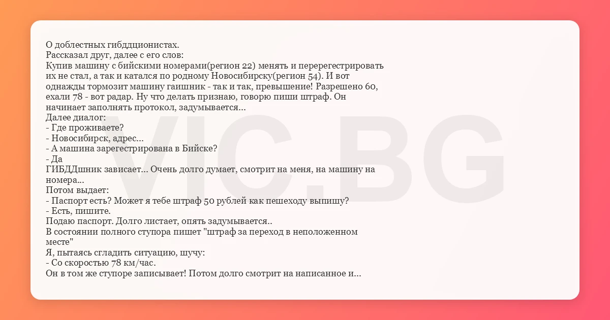 О доблестных гибддционистах. Рассказал друг, далее с его слов: Купив машину с бийскими номерами(регион 22) менять и перерегестрировать их не стал, а так и катался по родному Новосибирску(регион 54). И вот однажды тормозит машину гаишник - так и так, превышение! Разрешено 60, ехали 78 - вот радар. Ну что делать признаю, говорю пиши штраф. Он начинает заполнять протокол, задумывается... Далее диалог: - Где проживаете? - Новосибирск, адрес... - А машина зарегестрирована в Бийске? - Да ГИБДДшник зависает... Очень долго думает, смотрит на меня, на машину на номера... Потом выдает: - Паспорт есть? Может я тебе штраф 50 рублей как пешеходу выпишу? - Есть, пишите. Подаю паспорт. Долго листает, опять задумывается.. В состоянии полного ступора пишет "штраф за переход в неположенном месте" Я, пытаясь сгладить ситуацию, шучу: - Со скоростью 78 км/час. Он в том же ступоре записывает! Потом долго смотрит на написанное и виснет окончательно. Еле-еле вывел его из ступора и забрал квиток. С тех пор в коллекции красуется квиток штрафа "за переход в неположенном месте со скоростью 78 км/час." Вот такой вот скоростной пешеход!