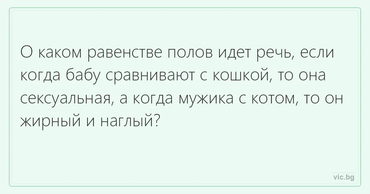 О каком равенстве полов идет речь, если когда бабу сравнивают с кошкой, то она сексуальная, а когда мужика с котом, то он жирный и наглый?<br />