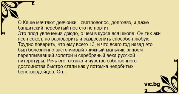 Это плод увлечения дзюдо, о чём в курсе вся школа. Он тих аки ясен сокол, но разговорить и развеселить способен любую. Трудно поверить, что ему всего 13, и что всего год назад это был болезненно застенчивый книжный мальчик, запоем переплывавший золотой и серебряный века русской литературы. Речь его, осанка и чувство собственного достоинства быстро стали как у потомка недобитых белогвардейцев. Он тайно влюбился в соседку снизу, раза в два его старше, попадался ей на глаза только в самых стильных своих прикидах, при встречах вспыхивал и пытался слиться со стенкой.