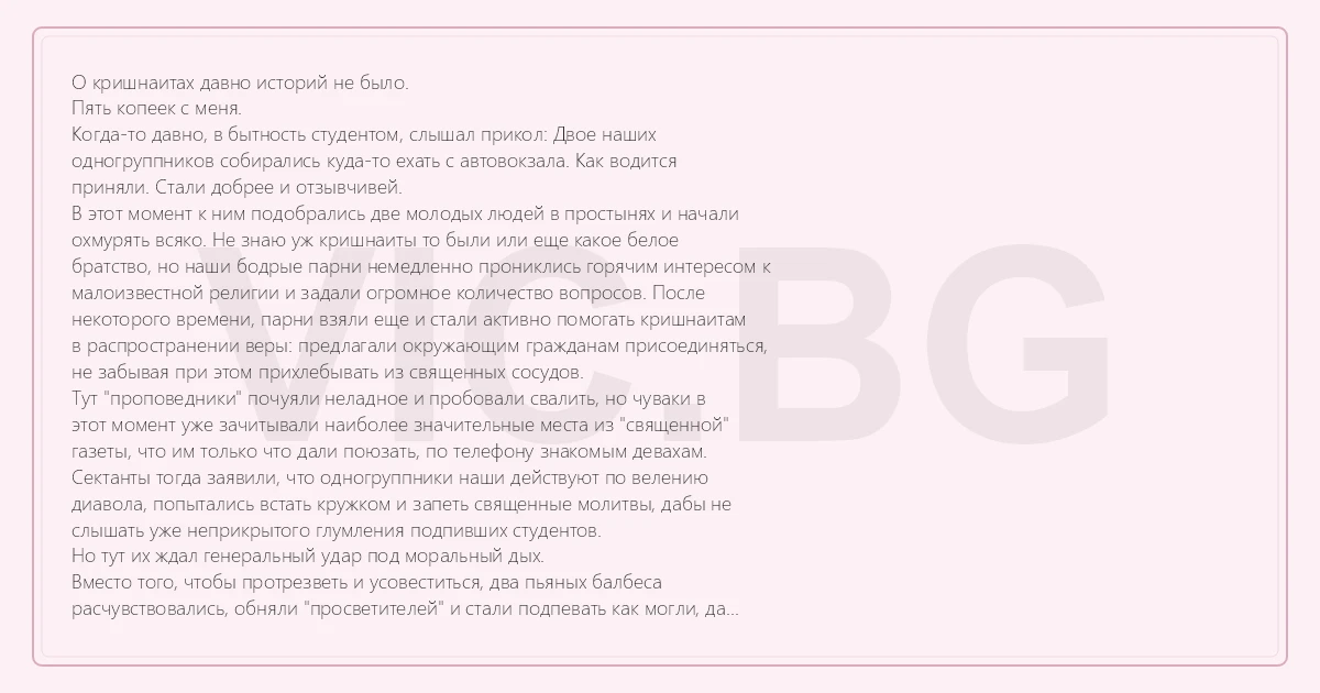 О кришнаитах давно историй не было. Пять копеек с меня. Когда-то давно, в бытность студентом, слышал прикол: Двое наших одногруппников собирались куда-то ехать с автовокзала. Как водится приняли. Стали добрее и отзывчивей. В этот момент к ним подобрались две молодых людей в простынях и начали охмурять всяко. Не знаю уж кришнаиты то были или еще какое белое братство, но наши бодрые парни немедленно прониклись горячим интересом к малоизвестной религии и задали огромное количество вопросов. После некоторого времени, парни взяли еще и стали активно помогать кришнаитам в распространении веры: предлагали окружающим гражданам присоединяться, не забывая при этом прихлебывать из священных сосудов. Тут "проповедники" почуяли неладное и пробовали свалить, но чуваки в этот момент уже зачитывали наиболее значительные места из "священной" газеты, что им только что дали поюзать, по телефону знакомым девахам. Сектанты тогда заявили, что одногруппники наши действуют по велению диавола, попытались встать кружком и запеть священные молитвы, дабы не слышать уже неприкрытого глумления подпивших студентов. Но тут их ждал генеральный удар под моральный дых. Вместо того, чтобы протрезветь и усовеститься, два пьяных балбеса расчувствовались, обняли "просветителей" и стали подпевать как могли, да в полный голос, да с надрывом. Народ в помещении автовокзала лежал штабелями со смеху, а кришнаиты в итоге сбежали. Holoduk
