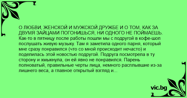 О ЛЮБВИ, ЖЕНСКОЙ И МУЖСКОЙ ДРУЖБЕ И О ТОМ, КАК ЗА ДВУМЯ ЗАЙЦАМИ ПОГОНИШЬСЯ, НИ ОДНОГО НЕ ПОЙМАЕШЬ.