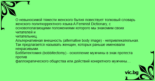О невыносимой тяжести женского бытия повествует толковый словарь женского политкорректного языка A Feminist Dictionary, с основополагающими положениями которого мы знакомим своих читателей и читательниц.