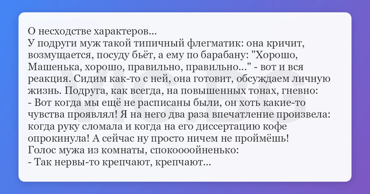 О несходстве характеров... У подруги муж такой типичный флегматик: она кричит, возмущается, посуду бьёт, а ему по барабану: "Хорошо, Машенька, хорошо, правильно, правильно..." - вот и вся реакция. Сидим как-то с ней, она готовит, обсуждаем личную жизнь. Подруга, как всегда, на повышенных тонах, гневно: - Вот когда мы ещё не расписаны были, он хоть какие-то чувства проявлял! Я на него два раза впечатление произвела: когда руку сломала и когда на его диссертацию кофе опрокинула! А сейчас ну просто ничем не проймёшь! Голос мужа из комнаты, спокоооойненько: - Так нервы-то крепчают, крепчают...