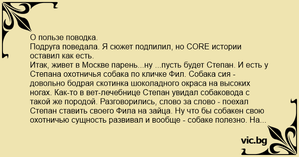 Итак, живет в Москве парень...ну ...пусть будет Степан. И есть у Степана охотничья собака по кличке Фил. Собака сия - довольно бодрая скотинка шоколадного окраса на высоких ногах. Как-то в вет-лечебнице Степан увидал собаковода с такой же породой. Разговорились, слово за слово - поехал Степан ставить своего Фила на зайца. Ну что бы собакен свою охотничью сущность развивал и вообще - собаке полезно. На базе Фила "поставили на зайца", потренировали и Фил даже реального зайца поймал и к хозяину припер. Бери, мол, хозяин добычу, чай не зря лопаю хлеб твой. Лето и осень пролетели быстро, Степа еще раза три скатался на базу - Фил был счастлив. Наступила зима. Зимой база не работает - Степан с Филом по парку гуляют. Снял Степа с поводка Фила, а сам закурил, да на молодых мам начал смотреть. Вдруг, слышит - вопли, визги, крики и всеобщая тревога. Но так, где-то далеко, за деревьями не видно. Степа продолжает курить, пока перед ним не возникает Фил. Фил держит зубами мелкую собачешку в ярком комбинезоне. Собачешка отчаянно визжит и пускает во все стороны лучи поноса. Фил стойко держит мелкую псинку. Пока Степа думал, что делать, мелкая псинка - брык и сознание теряет. Фил кидает тельце на снег и ждет поздравление от хозяина с успешной охотой. Степа в это время получает по башке поводком от подлетевшей хозяйки мелкой псины и на автомате сажает дамочку попой в сугроб. Ожившая от визга дамы мелкая псина отважно кусает Фила за ляжку и вся в поносе бросается на руки хозяйке...
