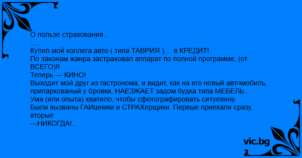 О пользе страхования... ..... Купил мой коллега авто ( типа ТАВРИЯ ).... в КРЕДИТ! По законам жанра застраховал аппарат по полной программе, (от ВСЕГО)!! Теперь --- КИНО! Выходит мой друг из гастронома, и видит, как на его новый автомобиль, припаркованый у бровки, НАЕЗЖАЕТ задом будка типа МЕБЕЛЬ... Ума (или опыта) хватило, чтобы сфотографировать ситуевину. Были вызваны ГАИшники и СТРАХерщики. Первые приехали сразу, вторые ---НИКОГДА! Мой товарищ вчинил иск... Представитель будки МЕБЕЛЬ, как и представитель СТРАХЕРЩИКА, не явились ни РАЗУ в судилище. И тут... мой любимый потерпевший просит высокий суд признать виновным (в наезде на будку (МЕБЕЛЬ )- его, и его же мятую ТАВРИЮ??????!!!!! ЗАТЕМ... Платит штраф за наезд на МЕБЕЛЬь -4 бакса, и вчиняет отдельный иск против страховой компании за неявку на игру. И... ПОКА СТРАХ КОМПАНИЯ ЧЕШЕТ РЕПУ И ИГНОРИРУЕТ КЛИЕНТА.... ентот клиент в ФОТОШОПЕ уродует свою ТАВРИЮ до состояния очень горбатого ЗАПОРОЖЦА и предьявляет фото в высокий суд! Глядя на ужасы и помятости автомобиля суд приписывает страхкомпании ОТСЛЮНЯВИТЬ истцу сумму, соизмеримую с НОВОЙ ТАВРИЕЙ! Самое смешное... СТРАХ-КОМПАНИЯ молча отслюнявила денежку, но на игру так и не явилась! С Т Р А Х У Й Т Е С Ь!!