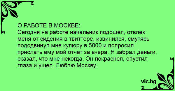 Сегодня на работе начальник подошел, отвлек меня от сидения в твиттере, извинился, смутясь пододвинул мне купюру в 5000 и попросил прислать ему мой отчет за вчера. Я забрал деньги, сказал, что мне некогда. Он покраснел, опустил глаза и ушел. Люблю Москву.