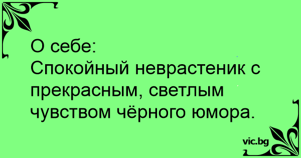 О себе:<br />Спокойный неврастеник с прекрасным, светлым чувством чёрного юмора.