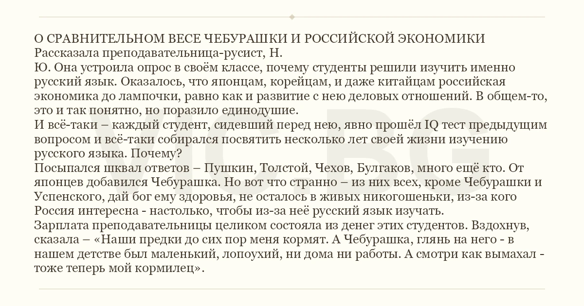 О СРАВНИТЕЛЬНОМ ВЕСЕ ЧЕБУРАШКИ И РОССИЙСКОЙ ЭКОНОМИКИ Рассказала преподавательница-русист, Н. Ю. Она устроила опрос в своём классе, почему студенты решили изучить именно русский язык. Оказалось, что японцам, корейцам, и даже китайцам российская экономика до лампочки, равно как и развитие с нею деловых отношений. В общем-то, это и так понятно, но поразило единодушие. И всё-таки – каждый студент, сидевший перед нею, явно прошёл IQ тест предыдущим вопросом и всё-таки собирался посвятить несколько лет своей жизни изучению русского языка. Почему? Посыпался шквал ответов – Пушкин, Толстой, Чехов, Булгаков, много ещё кто. От японцев добавился Чебурашка. Но вот что странно – из них всех, кроме Чебурашки и Успенского, дай бог ему здоровья, не осталось в живых никогошеньки, из-за кого Россия интересна - настолько, чтобы из-за неё русский язык изучать. Зарплата преподавательницы целиком состояла из денег этих студентов. Вздохнув, сказала – «Наши предки до сих пор меня кормят. А Чебурашка, глянь на него - в нашем детстве был маленький, лопоухий, ни дома ни работы. А смотри как вымахал - тоже теперь мой кормилец».