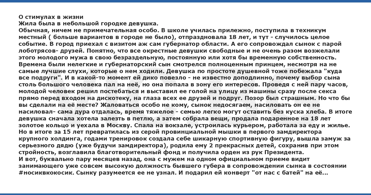 Обычная, ничем не примечательная особо. В школе училась прилежно, поступила в техникум местный ( больше вариантов в городе не было), отпраздновала 18 лет, и тут - случилось целое событие. В город приехал с визитом аж сам губернатор области. А его сопровождал сынок с парой лоботрясов- друзей. Понятно, что все окрестные девушки свободные и не очень разом возжелали этого молодого мужа в свою безраздельную, постоянную или хотя бы временную собственность. Времена были нелегкие и губернаторский сын смотрелся полноценным принцем, несмотря на не самые лучшие слухи, которые о нем ходили. Девушка по простоте душевной тоже побежала "куда все подруги". И в какой-то момент ей дико повезло - не известно доподлинно, почему выбор сына столь большого человека пал на неё, но она попала в зону его интересов. Проведя с ней пару часов, молодой человек решил постебаться и выставил ее голой на улицу из машины сразу после cekca прямо перед входом на дискотеку, на глаза всех ее друзей и подруг. Позор был страшным. Но что бы вы сделали на её месте? Жаловаться особо не кому, сынок недосягаем, насиловать он ее не насиловал- сама дура отдалась, время тяжелое - семью легко могут оставить без куска хлеба. В итоге девушка сначала хотела залезть в петлю, а затем собрала вещи, продала подаренное на 18 лет золотое кольцо и уехала в Москву. Спала на вокзале, устроилась курьером, работала за еду и жилье. Но в итоге за 15 лет превратилась из серой провинциальной мышки в первого замдиректора крупного холдинга, годами тренировок создала себе шикарную спортивную фигуру, вышла замуж за серьезного дядю (уже будучи замдиректора), родила ему 2 прекрасных детей, сохранив при этом стройность, возглавила благотворительный фонд и получила орден из рук Президента.