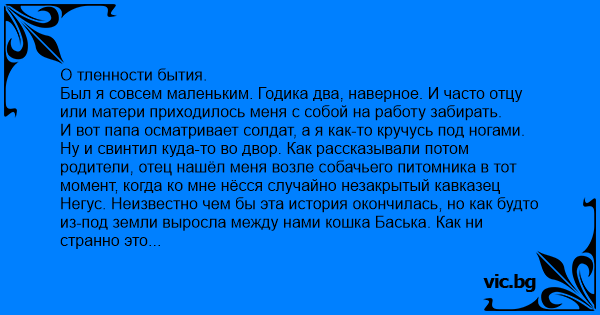 И вот папа осматривает солдат, а я как-то кручусь под ногами. Ну и свинтил куда-то во двор. Как рассказывали потом родители, отец нашёл меня возле собачьего питомника в тот момент, когда ко мне нёсся случайно незакрытый кавказец Негус. Неизвестно чем бы эта история окончилась, но как будто из-под земли выросла между нами кошка Баська. Как ни странно это заставило затормозить Негуса и покорно подойти ко мне. Такая живая игрушка «шабака» была радостной добычей. Лохматая шерсть! Короткие уши! Высунутый слюнявый язык! Ах как приятно это всё было елозить руками и тянуть в разные стороны! Отец замер, боясь спровоцировать зверя. Дети не всегда понимают опасность. А вот все остальные... Отец чуть не умер от страха. Я чуть не обосцался от радости. Пёс чуть не получил от кинолога. Кинолог чуть не получил от начпогза. А кошка чуть не... А кошка просто посидела возле нас и пошла дальше.