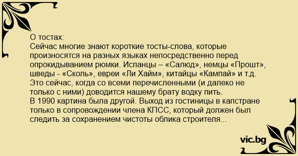 Сейчас многие знают короткие тосты-слова, которые произносятся на разных языках непосредственно перед опрокидыванием рюмки. Испанцы – «Салюд», немцы «Прошт», шведы - «Сколь», евреи «Ли Хайм», китайцы «Кампай» и т.д. Это сейчас, когда со всеми перечисленными (и далеко не только с ними) доводится нашему брату водку пить.