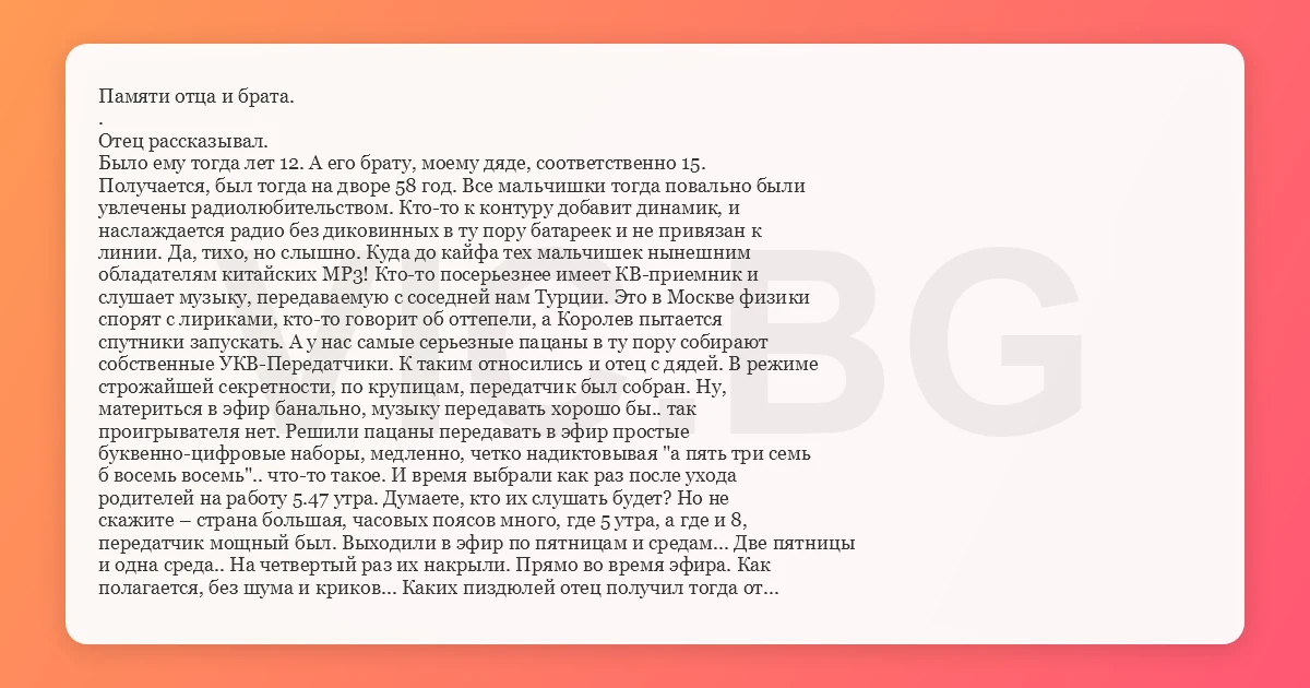 Памяти отца и брата. . Отец рассказывал. Было ему тогда лет 12. А его брату, моему дяде, соответственно 15. Получается, был тогда на дворе 58 год. Все мальчишки тогда повально были увлечены радиолюбительством. Кто-то к контуру добавит динамик, и наслаждается радио без диковинных в ту пору батареек и не привязан к линии. Да, тихо, но слышно. Куда до кайфа тех мальчишек нынешним обладателям китайских МР3! Кто-то посерьезнее имеет КВ-приемник и слушает музыку, передаваемую с соседней нам Турции. Это в Москве физики спорят с лириками, кто-то говорит об оттепели, а Королев пытается спутники запускать. А у нас самые серьезные пацаны в ту пору собирают собственные УКВ-Передатчики. К таким относились и отец с дядей. В режиме строжайшей секретности, по крупицам, передатчик был собран. Ну, материться в эфир банально, музыку передавать хорошо бы.. так проигрывателя нет. Решили пацаны передавать в эфир простые буквенно-цифровые наборы, медленно, четко надиктовывая "а пять три семь б восемь восемь".. что-то такое. И время выбрали как раз после ухода родителей на работу 5.47 утра. Думаете, кто их слушать будет? Но не скажите – страна большая, часовых поясов много, где 5 утра, а где и 8, передатчик мощный был. Выходили в эфир по пятницам и средам... Две пятницы и одна среда.. На четвертый раз их накрыли. Прямо во время эфира. Как полагается, без шума и криков... Каких пиздюлей отец получил тогда от своего отца, он не рассказывал. Передатчик был конфискован, а паяльник заброшен в самый дальний угол чердака. Брат рассказывал. Учился он тогда в ФизТехе. Курс 4й был. Решили они с одногруппниками развлечься. В качестве развлечения выбрали следующий метод. Встречаются они на многолюдной станции метро. Один, как полагается, приезжает чуть раньше, и ставит свои дипломат чуть задвинув под лавку. Приезжает второй, и ставит свой дипломат рядом. Потом первый, ни говоря ни слова, встает, и берет дипломат второго, и уезжает на ближайшем поезде. Второй забирает дипломат первого, и тоже покидает условленное место. И так несколько раз, меняя условленные места. То в метро встретятся, но на Пушкинской, то еще где-то. Параллельно развлекались еще тем, что один бросит пустую пачку из-под сигарет, а другой, идя ему на встречу, непременно поднимет, и в карман положит. Через 3 недели решили они испытать, как действует система. В очередной раз один из них берет дипломат и входит в вагон. Но не проходит вглубь, а против обыкновения становится у двери. В момент, когда машинист объявляет "осторожно, двери закрываются", и двери начинают закрываться, студент выскакивает из вагона. К полной неожиданности тех двух в штатском, которые тоже вдруг решили выйти. Всю компанию взяли на следующий день. После недолгого разбирательства, к чести, сказать, все узнавшего деканата, шутников не выгнали (ну за что, правда, ведь кроме лекций в дипломатах ничего не было) и разрешили продолжить учебу. Еще через 10 лет вчерашние студенты успешно запустили Буран в космос и вернули его обратно. Но туалеты в квартирах бывших студентов долго были обклеены свидетельствами тогда вдруг ставших никому не нужными изобретений, Буран сгнил в качестве аттракциона в парке Горького. А вместе с ним сгнила и служба, над которой прикалывались отец с дядей и брат. Иначе разве случились бы взрывы домов в Москве и Волгодонске, были бы захвачены дети в Бе