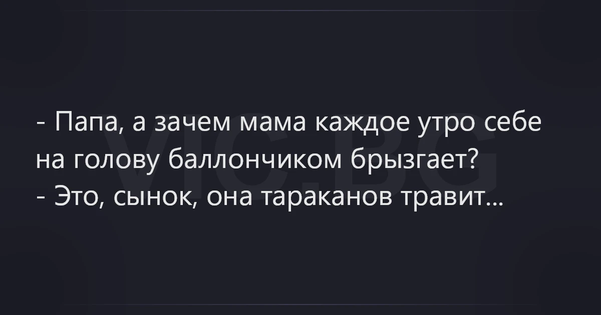 - Папа, а зачем мама каждое утро себе на голову баллончиком брызгает? - Это, сынок, она тараканов травит...