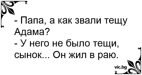 - Тато, а як звали тещу Адама? - У нього не було тещі, синку ... Він жив у раю.