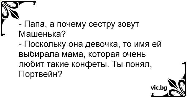 - Поскольку она девочка, то имя ей выбирала мама, которая очень любит такие конфеты. Ты понял, Портвейн?