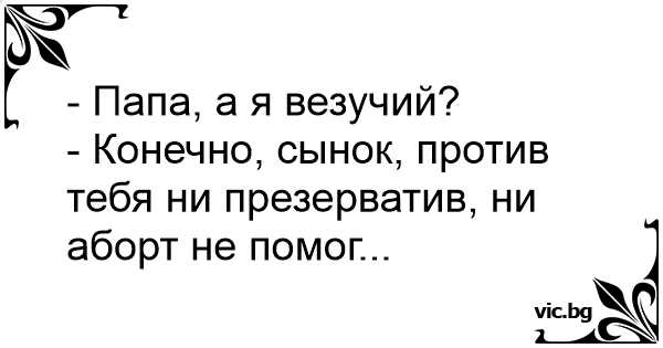 - Тате, аз късметлия ли съм ? - Тате, аз късметлия ли съм? - Късметлия си, сине. Теб, нищо не може да те спре в живота - ни презерватив, ни аборт... - Тате, аз късметлия ли съм? - Да, синчето ми! Срещу тебе нито презерватив, нито аборт помогнаха… — Тату, а я везучий? — Звичайно, синку, проти тебе ні презерватив, ні аборт не допоміг...