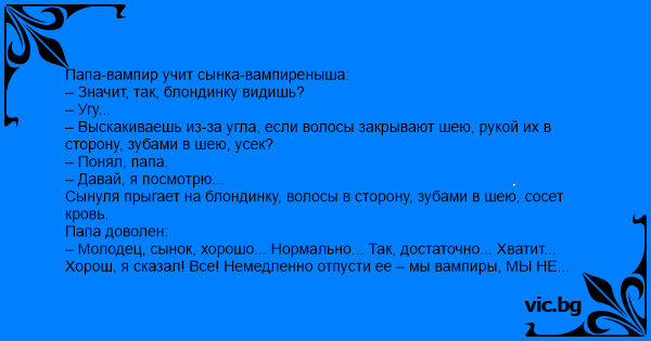 – Молодец, сынок, хорошо... Нормально... Так, достаточно... Хватит... Хорош, я сказал! Все! Немедленно отпусти ее – мы вампиры, МЫ НЕ РАБОТНИКИ БАНКА!!!