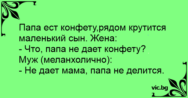 Папа ест конфету,рядом крутится маленький сын. Жена:<br />- Что, папа не дает конфету?<br />Муж (меланхолично):<br />- Не дает мама, папа не делится.