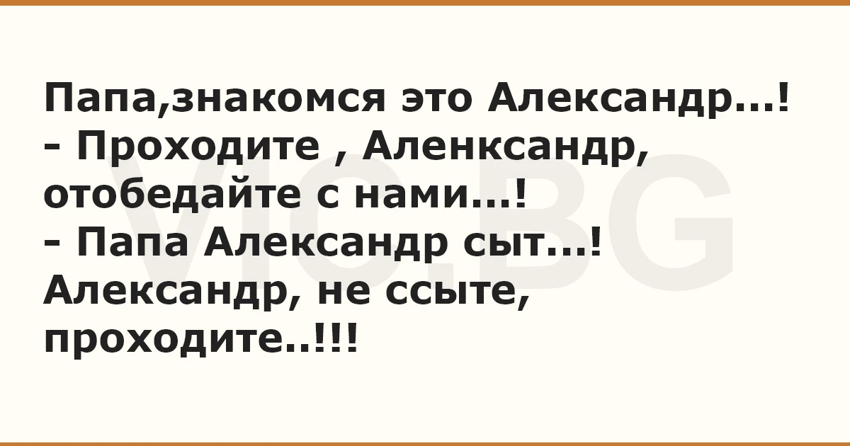 Папа,знакомся это Александр...! - Проходите , Аленксандр, отобедайте с нами...! - Папа Александр сыт...! Александр, не ссыте, проходите..!!!