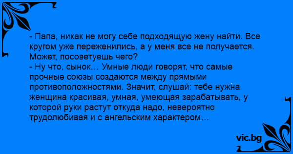 - Ну что, сынок… Умные люди говорят, что самые прочные союзы создаются между прямыми противоположностями. Значит, слушай: тебе нужна женщина красивая, умная, умеющая зарабатывать, у которой руки растут откуда надо, невероятно трудолюбивая и с ангельским характером…